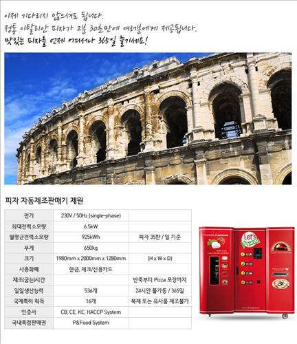 피엔푸드시스템㈜(www.pnfoodsystem.com)은 갓 구운 신선한 피자를 24시간, 365일 즐길 수 있는 피자 자동제조판매기(Pizza Vending Machine)를 선보였다고 12일 밝혔다.