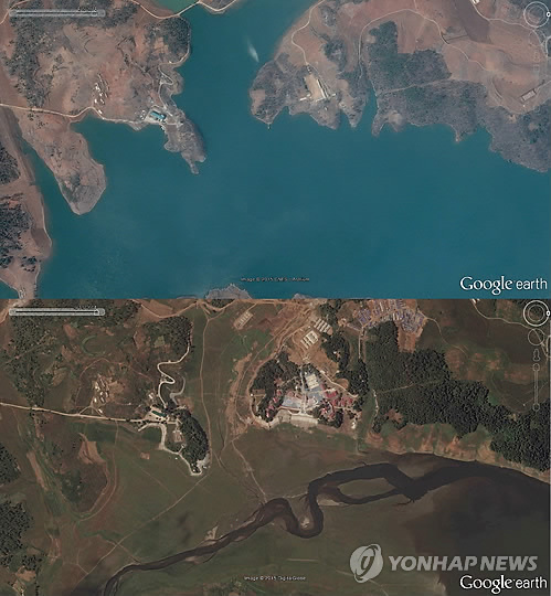 | △ 극심한 가뭄으로 말라버린 북한 연풍호 (서울 구글=연합뉴스) 극심한 가뭄으로 북한 평안남도 개천시 연풍호가 메마른 모습이다. 연풍호에는 북한이 최신 시설을 갖춘 과학자 전용 휴양지로 자랑하는 연풍과학자휴양소가 있다. 구글어스 위성사진을 보면 연풍호의 2014년 4월 사진(위)은 물이 가득 차 있지만 2014년 9월 사진(아래)은 가뭄으로 물이 말라버린 모습이 확인된다. 2015.5.12 <위 사진 크레디트는 (구글/연합뉴스)로 표기해야 하며 뉴스보도 목적으로만 사용가능(판매금지) 합니다.> nkphoto@yna.co.kr |
