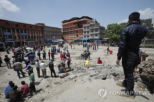 | △ 모두 공터로..네팔 2차 지진 (박타푸르 AP=연합뉴스) 지난달 25일 지진으로 큰 피해를 당한 네팔의 박타푸르에 12일(현지시간) 낮 12시 50분 쯤 규모 7.3의 2차 지진이 발생하자 주민들이 학교 운동장처럼 보이는 공터에 모여 있다. 미국 지질조사국(USGS)은 지진이 에베레스트와 가까운 마을 남체 바자르(Namche Bazar)에서 서쪽으로 68㎞ 떨어진 지역에서 지진이 발생했다고 밝혔다. |