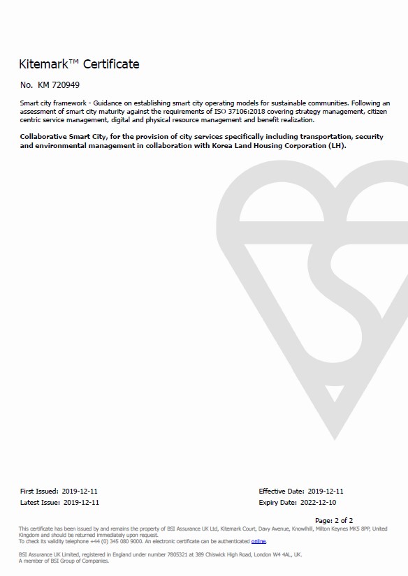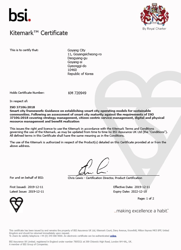 ‘스마트시티 국제인증(ISO37106)’은 전 세계의 스마트시티 표준화 및 지속가능한 도시 건설을 위해 세계표준화기구(ISO)가 2018년 7월에 제정한 스마트시티 국제표준이다. 평가지표는 디지털 및 도시정보의 활용노력, 시민의 참여도, 도시운영관리 및 대시민 서비스 수준 등으로 구성되는데, 고양시는 지난 10여 년간 추진해왔던 스마트시티 운영경험을 토대로 스마트시티 국제인증 심사를 높은 점수로 통과했다.