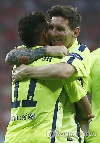 | △ 득점에 성공한 네이마르를 축하하는 리오넬 메시(오른쪽).(AP=연합뉴스) |