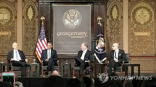 △ (워싱턴=연합뉴스) 심인성 특파원 = 버락 오바마 미국 대통령이 12일(현지시간) 워싱턴D.C. 조지타운 대학 내 개스톤 홀에서 빈곤 극복을 주제로 열린 '가톨릭 복음주의 리더십 서밋'에 패널로 참석하고 있다. 미국 대통령이 특정 행사의 초청 연사가 아니라 패널로 참석한 것은 매우 이례적이다. 이는 유튜브 인터뷰, 토크쇼 출연, 코믹 홍보영상 제작 등 오바마 대통령이 최근 이어가는 '파격 행보'의 연장선이다. 2015.5.13 sims@yna.co.kr
