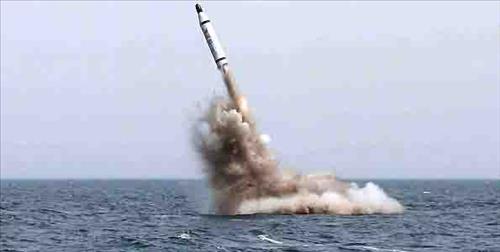 △ 북한 전략잠수함서 탄도탄 '북극성' 발사 (서울=연합뉴스) 북한은 지난 9일 전략잠수함의 탄도탄 수중시험발사에 성공했다고 밝혔다. 사진은 북한 노동당 기관지 노동신문에 공개된 탄도탄 발사 모습.