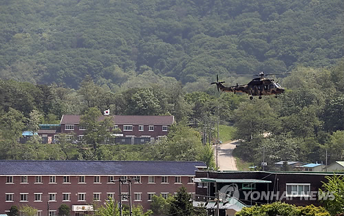 △ 분주한 예비군훈련장 (서울=연합뉴스) 신준희 기자 = 13일 총기 사고가 발생한 서울 내곡동 예비군훈련장에 헬기가 내리고 있다. 오른쪽 오르막길이 사고 장소인 사격장으로 향하는 길. 2015.5.13 hama@yna.co.kr