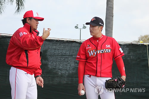 △ 여건욱 지도하는 김상진 코치 (서울=연합뉴스) 미국 플로리다에서 새 시즌을 준비중인 프로야구 SK 와이번스 여건욱이 김상진 코치의 지도를 받고 있다. 2015.1.25 << SK 와이번스 제공 >> photo@yna.co.kr