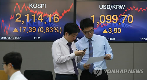 | △ 코스피 2,110선 회복 (서울=연합뉴스) 박지호 기자 = 코스피가 13일 외국인과 기관의 매수세에 힘입어 전날보다 17.39포인트(0.83%) 오른 2,114.16에 장을 마쳤다. 사진은 이날 오후 서울 을지로 외환은행 본점 딜링룸의 모습. |