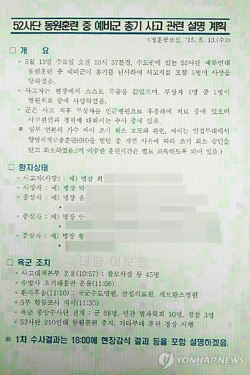 | △ 육군 작성 '부상 예비군 실명자료' SNS에 유출 (서울=연합뉴스) 서울 내곡동 동원예비군 훈련장에서 13일 발생한 총기 난사 사건 부상자들의 실명이 적힌 군 내부 자료가 SNS(사회관계망서비스)에 유출된 것으로 알려져 논란이 되고 있다. 이 사진은 유출된 군 내부 자료. 2015.5.13 photo@yna.co.kr |