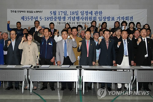△ 5·18 민중항쟁 35주년 기념행사위원회가 지난 11일 광주YMCA에서 열린 기자회견에서 님을 위한 행진곡을 제창하고 있다.(연합뉴스 자료사진)