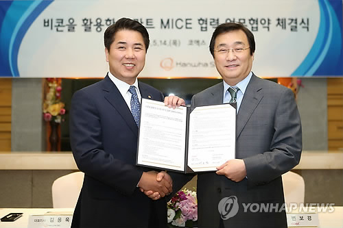 | △ 코엑스-한화S&C, 비콘 활용 '스마트 전시장' 기술개발 협약 (서울=연합뉴스) 변보경 코엑스 대표(오른쪽)와 김용욱 한화S&C 대표이사가 14일 오전 서울 강남구 삼성동 코엑스에서 차세대 사물인터넷(IoT) 기술인 비콘(beacon)을 활용한 스마트 전시장 기술개발 협약을 체결하고 있다. 2015.5.14 << 코엑스 제공 >> photo@yna.co.kr |