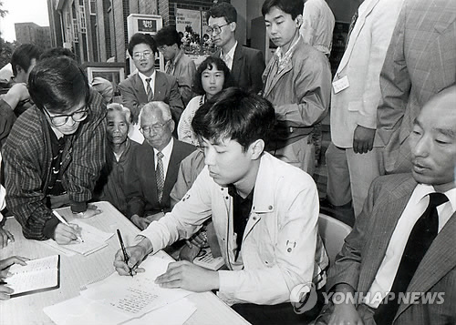| △ 무죄확정된 강기훈씨 (서울=연합뉴스) '한국판 드레퓌스 사건'으로 불리는 유서대필 사건의 강기훈(51)씨가 재심에서 무죄 확정 판결을 받았다. 사건 발생 24년 만이다. 1991년 당시 사전구속영장이 발부된 강씨가 필적을 보여주고 있다. 2015.5.14 << 연합뉴스 DB >> photo@yna.co.kr |