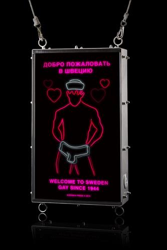 핑크색 하트가 둥둥 떠다니는 애니메이션의 상단에는 '스웨덴에 온 것을 환영합니다'라는 글귀가 러시아어로 적혀 있고, 아래에는 영어로된 같은 글귀와 더불어 '1944년 이후 게이'라는 문구가 추가돼 있다. 1944년은 스웨덴에서 동성애가 합법화된 해다.