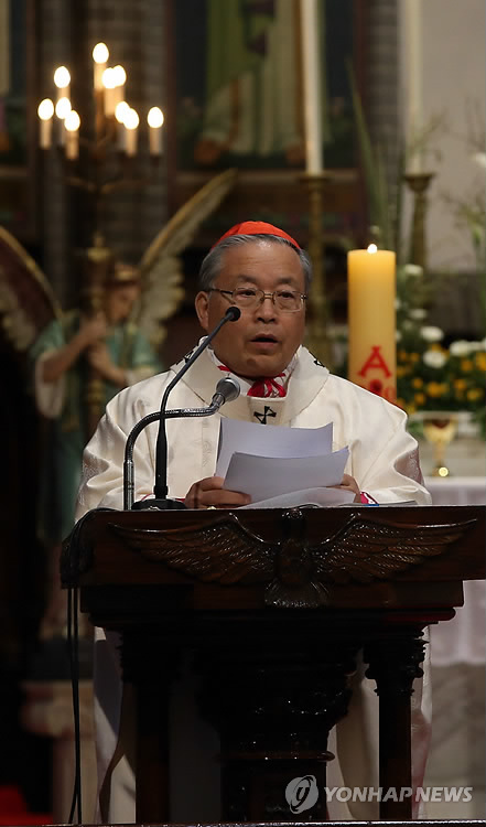| △ 염수정 추기경. 사진은 염 추기경이 지난달 세월호 참사 1주년을 맞아 서울 명동성당에서 추모 미사를 주례하는 모습이다.2015.5.14.<<연합뉴스DB>> |