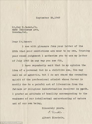 무신론자인 아인슈타인은 이 서신에서 "신을 믿는다는 것은 순진한 것"이라면서 "(종교를 믿는다는 것보다도) 자연과 인간 존재에 대한 우리의 부족한 지적 능력에 상응해 겸손한 태도를 보이는 것을 난 선호한다"고 썼다.