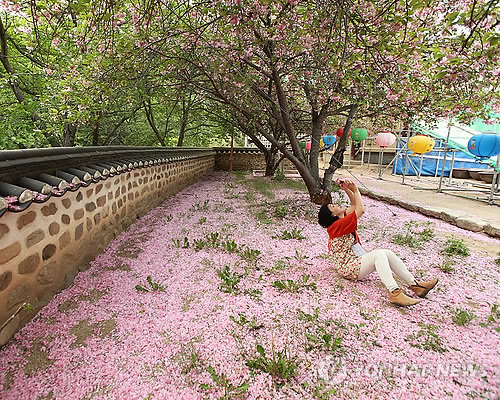 △ (청송=연합뉴스) 성연재 기자 = 진 꽃도 꽃이다. 주왕산 대전사 겹벚꽃이 아름답게 떨어진 곳에서 여행자가 사진을 찍고 있다.2015.5.15 polpori@yna.co.kr