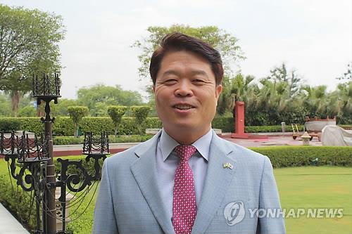 △ 삼성전자 서남아 총괄 홍현칠 전무 (뉴델리=연합뉴스) 나확진 특파원 = 삼성전자 서남아 총괄 홍현칠 전무가 13일(현지시간) 인도 뉴델리에서 연합뉴스와 인터뷰를 한 후 포즈를 취하고 있다.