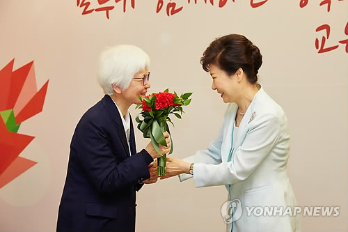 | △ 은사에게 카네이션 선물하는 박 대통령 (서울=연합뉴스) 박근혜 대통령이 15일 오전 서울 서초구 양재동 더케이호텔에서 열린 제 34회 스승의 날 기념식에 앞서 성심여고 1학년 때 담임 선생님이었던 박정미 선생님에게 카네이션을 선물하고 있다. (청와대 제공) |