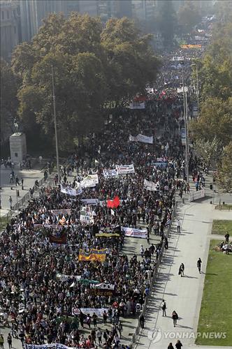 △ (산티아고 AP=연합뉴스) 14일(현지시간) 칠레 수도 산티아고에서 고등학생과 대학생들이 정부의 교육개혁 약속 이행 지체를 규탄하는 시위를 벌이고 있다. 산티아고를 비롯한 주요 도시에서 올들어 두 번째로 일제히 열린 이날 대규모 집회에서 학생 시위대는 공교육 무상교육을 속히 실시하라고 촉구했다. marshal@yna.co.kr