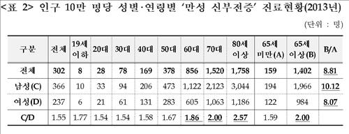 인구 10만명당 진료인원은 65세 이상이 1천402명으로, 65세 미만의 159명보다 8.8배나 높았다. 65세 미만 대비 65세 이상의 배율은 남성이 10.1배로 여성의 8.1배보다 더 컸다.