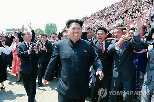 △ 북한 김정은, 청년미풍선구자대회 참가자와 기념사진 (서울=연합뉴스) 김정은 북한 국방위원회 제1위원장이 제2차 전국청년미풍선구자대회 참가자들과 기념사진을 찍었다고 노동신문이 17일 보도했다. 촬영에는 황병서 군 총정치국장, 최룡해 노동당 비서, 리일환 당 부장, 전용남 청년동맹 중앙위원장이 함께했다. 사진은 김 제1위원장이 촬영에 참여한 주민들로부터 환호를 받는 모습. 2015.5.17 nkphoto@yna.co.kr