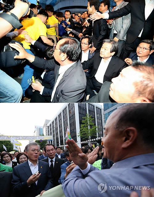 △ 불청객 된 여야 대표 (광주=연합뉴스) 형민우 기자 = 새누리당 김무성 대표(위 사진)와 새정치민주연합 문재인 대표가 17일 오후 광주 동구 금남로에서 열린 5·18광주민주화운동 전야제에 참석했다가 광주 방문을 반대하는 시민들의 항의를 받고 있다. 김 대표는 결국 전야제 행사에 참석하지 못하고 자리를 떴으며 이 과정에서 취재진과 시민, 경찰 사이에서 몸싸움이 벌어지기도 했다.