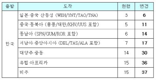 유럽·아프리카 노선은 15달러에서 36달러, 중동·대양주 노선은 14달러에서 30달러, 서남아시아·중앙아시아 노선은 7달러에서 17달러, 동남아 6달러에서 14달러, 중국·동북아 5달러에서 11달러, 일본·중국 산둥성은 3달러에서 6달러로 각각 조정된다.