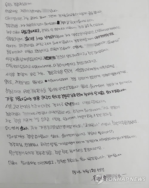 A씨는 편지에 "너도 고생했다. 하지만 힘들어도 정직하게 살아왔어야지. 이 한 마디 따끔한 충고가 엄마, 아빠, 세상 사람들로부터 받은 상처를 다 씻어줬습니다"며 유치장관리팀 직원들에게 감사의 마음을 전했다.