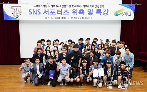 △ '뉴욕페스티벌 IN 여주 2015' SNS 서포터스 출범 (여주=연합뉴스) 여주시는 18일 오후 여주대학교 마로니에홀에서 '뉴욕페스티벌 IN 여주 2015' SNS 서포터스 회원 위촉식을 했다. 2015.5.18 <<여주시 제공>> kcg33169@yna.co.kr