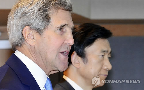 | △ 한·미 외교장관 공동 기자회견 (서울=연합뉴스) 전수영 기자 = 윤병세 외교부 장관과 존 케리 미국 국무장관이 18일 오후 서울 외교부 청사 국제회의장에서 공동 기자회견을 하고 있다. |
