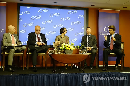 △ KEI 주최 토론회 참석한 미국 무역전문가들 (워싱턴=연합뉴스) 김세진 특파원 = 18일(현지시간) 워싱턴DC에서 한미경제연구소(KEI) 주최로 열린 '동아시아 자유무역의 미래' 토론회에 참석한 미국 무역전문가들. 왼쪽부터 사회자인 트로이 스탠거론 KEI 연구원, 데릭 시저스 미국기업연구소(AEI) 연구원, 미레야 솔리스 브루킹스연구소 일본석좌, 제임스 파더리 한미재계회의 부회장, 에드워드 올든 미국외교협회(CFR) 선임연구원. 2015.5.19. smile@yna.co.kr