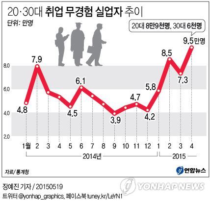 19일 통계청에 따르면 20∼30대 취업 무경험 실업자는 지난달 기준 9만5천 명으로 집계됐다. 20대가 8만9천 명, 30대는 6천 명이었다.