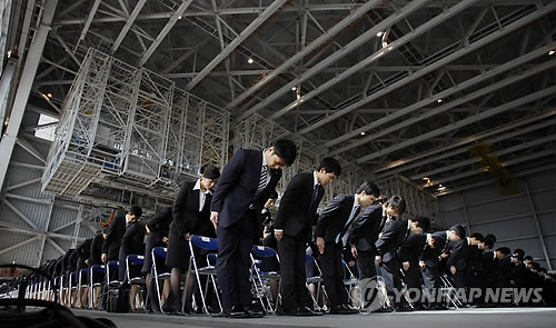 △ 올봄 일본 대졸자의 취업률이 96.7%를 기록했다. 사진은 전일본공수(ANA) 입사식. (AP=연합뉴스 자료사진)