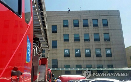| △ 법원서 투신시위 벌이고 있는 민원인 (수원=연합뉴스) 20일 오후 경기도 수원시 영통구 원천동 수원지법 내 4층짜리 별관 건물 옥상에서 60대로 보이는 한 남성이 투신하겠다며 자살 소동을 벌이고 있다. 2015.5.20 <<경기도재난안전본부>> you@yna.co.kr |