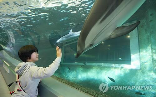 △ (EPA=연합뉴스.자료사진) 한 소녀가 일본 와카야마현 다이지초의 수족관에서 헤엄치는 돌고래를 바라보고 있는 모습.