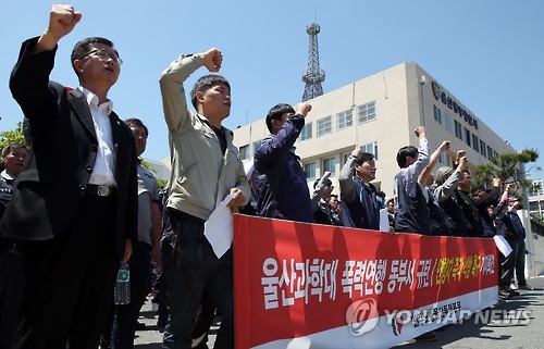△ 경찰서 앞에서 열린 기자회견 (울산=연합뉴스) 김용태 기자 = 21일 오전 울산 동부경찰서 정문 앞에서 민주노총 울산본부가 기자회견을 열고 구호를 외치고 있다. 이들은 20일 울산과학대 본관 점거 시위 과정에서 연행된 조합원 22명을 석방해달라고 촉구했다. 2015.5.21 yongtae@yna.co.kr