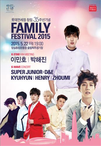 롯데면세점은 창립 35주년 기념으로 22~24일 잠실 주경기장에서 개최하는 2015 패밀리 페스티벌에 이민호, 박해진, 슈퍼주니어, 엑소, 신화, 이승철, 김범수, AOA 등이 참석한다고 21일 밝혔다.