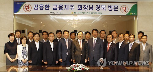 △ 김용환 NH농협금융지주회장 경북 방문 (대구=연합뉴스) 김용환 NH농협금융지주 회장이 21일 NH농협은행 경북영업본부를 방문해 경북지역 자회사 대표 등 직원들과 기념촬영을 하고 있다. 2015.5.21 haru@yna.co.kr