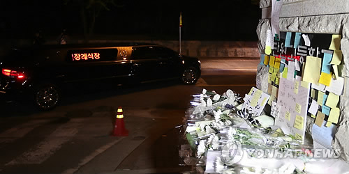 △ <여객선침몰> 단원고 교감 발인 (안산=연합뉴스) 특별취재팀 = 지난해 4월21일 새벽 침몰 여객선 세월호에서는 구조됐지만 결국 숨진 채 발견된 안산 단원고 교감의 장례식이 열려 운구차량이 경기도 안산 단원고 운동장을 돈 뒤 학교를 나서고 있다. 2014.4.21 drops@yna.co.kr http://blog.yonhapnews.co.kr/geenang