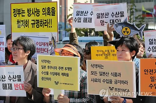 | △ 2014년 10월 6일 서울 광화문광장에서 열린 기자회견에서 참가자들이 일본산 식품의 전면 수입금지 등을 요구하는 피켓을 들고 있다.(연합뉴스 자료사진) |