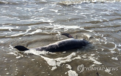 | △ In this photo taken May 10, 2015, a dead dolphin washes ashore in the Gulf of Mexico on Grand Isle, La. National Oceanic and Atmospheric Administration (NOAA) scientists stated in a report released, Wednesday, May 20, 2015, that there are links between BP's catastrophic 2010 oil spill and a spate of dolphin deaths since the spill. The study is part of a wide-ranging assessment of ecological damage caused by the spill. BP has rejected that contention and said necropsies of dolphins and "other information reveal there is no evidence" to make the link between the spill and dolphin deaths. (AP Photo/Cain Burdeau) |