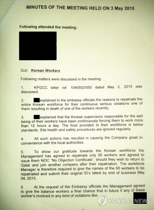 (서울=연합뉴스) 차지연 기자 = 카타르의 유명 건설회사인 CDC에서 일하다 근로규정 위반 등의 이유로 집단 해고된 북한 건설노동자 90명이 카타르에서 추방됐다.