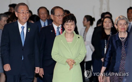 | △ 박근혜 대통령과 반기문 유엔사무총장 등 참석자들이 지난 19일 인천시 송도 컨벤시아에서에서 열린 세계교육포럼 개회식에 참석하고 있다. |