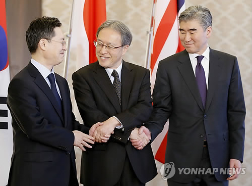 | △ 황준국(왼쪽) 한국 외교부 한반도평화교섭본부장, 성 김(오른쪽) 미국 국무부 대북정책 특별대표, 이하라 준이치(가운데) 일본 외무성 아시아대양주국장 (연합뉴스 자료사진) |