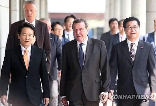 슈뢰더 전 총리는 북한의 인권침해, 핵무기개발 등을 비판하면서도 "한국이 대화를 위해 북에 손을 내밀고 있다. 북한이 안 잡고 후퇴하더라도 내민 손을 거두면 안 된다"고 했다.