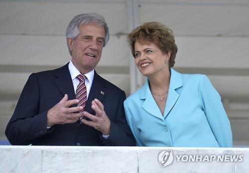 △ 지우마 호세프 브라질 대통령(오른쪽)과 타바레 바스케스 우루과이 대통령이 21일(현지시간) 브라질리아에서 정상회담을 했다.(AP=연합뉴스)