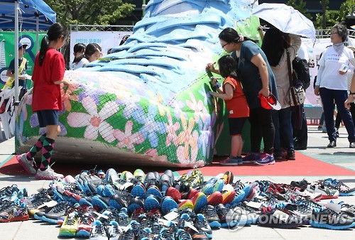 | △ 몽골 청소년을 위한 '희망의 운동화' 나눔 축제 (서울=연합뉴스) 김주성 기자 = 23일 서울 광화문광장에서 어렵게 생활하는 몽골 청소년들을 돕기 위해 열린 '희망의 운동화 나눔 축제'에서 시민들이 대형 운동화 모형에 희망의 메시지를 적고 있다. 이번 나눔축제를 통해 몽골에 전달될 운동화는 관세청이 국내 유명 브랜드의 상표권을 침해해 몰수된 위조 운동화 1만 290점을 서울시립청소년문화교류센터에 기증한 것이다. 2015.5.23 utzza@yna.co.kr |