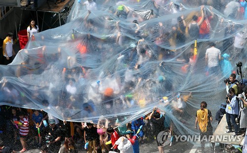 | △ 춘천마임축제 개막축하 '아수라장' 행사 (춘천=연합뉴스) 이상학 기자 = 강원 춘천시의 대표축제인 '2015 춘천마임축제'가 24일 오후 중앙로 거리에서 개막한 가운데 축하행사로 공연자와 관람객이 함께 물을 뿌리는 '아!水(수)라장' 프로그램이 펼쳐지고 있다. 사진은 관객들이 대형 비닐을 덮은 모습. 올해 춘천마임축제는 31일까지 열린다. 2015.5.24 hak@yna.co.kr |