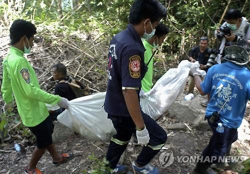 | △ 지난 2일(현지시간) 태국 남부 송클라주에서 발견된 무덤에서 태국 구조당국이 로힝야족으로 추정되는 시신을 수습하고 있다. (epa=연합뉴스) |
