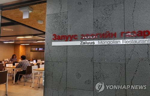 | △ 몽골 식당 '잘루스' (서울=연합뉴스) 신재우 기자 = 서울 동대문 쇼핑타운 부근에 위치한 몽골 식당 '잘루스'. 지난 2006년 문을 연 이곳은 몽골 이주민이 운영하고 있다. 2015.5.22 withwit@yna.co.kr |