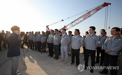 | △ 박근혜 대통령이 지난 3월 2일 오후(현지시각) 쿠웨이트 자베르 연륙교 건설현장을 방문, 공사 모습을 둘러보며 근로자들에게 격려의 인사말을 하고 있다. 36.1km길이의 연륙교인 '쉐이크 자베르 코즈웨이‘는 현대건설과 GS건설이 공사에 참여하고 있으며 2018년 완공예정이다. (연합뉴스 자료사진) |