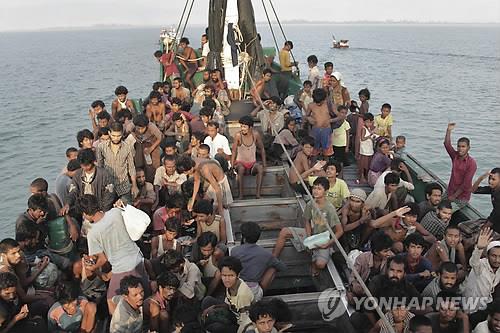 | △ (반다아체<인도네시아> AP=연합뉴스 자료사진) 로힝야족 난민들이 지난 20일 인도네시아 아체주 해상에서 인근에 있는 인도네시아 어선들이 구조해 주기를 애타게 기다리고 있다. 말레이시아와 인도네시아는 이날 동남아시아 해상을 떠돌고 있는 미얀마 출신 로힝야족과 방글라데시 난민들에게 임시 피난처를 제공하기로 합의해 동남아 국가의 외면으로 선상에서 굶주림과 폭력에 시달리던 난민들이 죽음의 고비를 넘기게 됐다. |